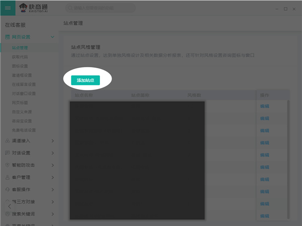 3、點擊“添加站點”隨便添加一個有備案的網站域名(因為要過驗證),可以添加多個url地址,為不同的頁面來生成不同樣式的客服窗口。