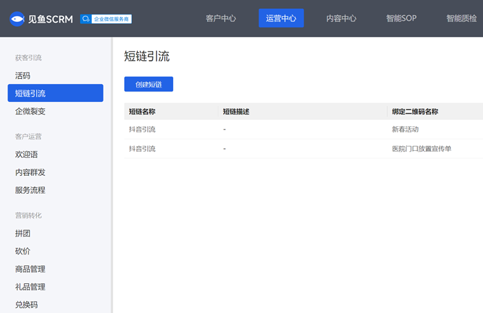 1、醫美機構私域引流目前主流的方法就是在抖音等平臺通過短鏈接跳轉小程序,用戶識別二維碼后添加機構咨詢師的企業微信,這種方式是借助SCRM系統生成短鏈接和營銷活碼來實現的。