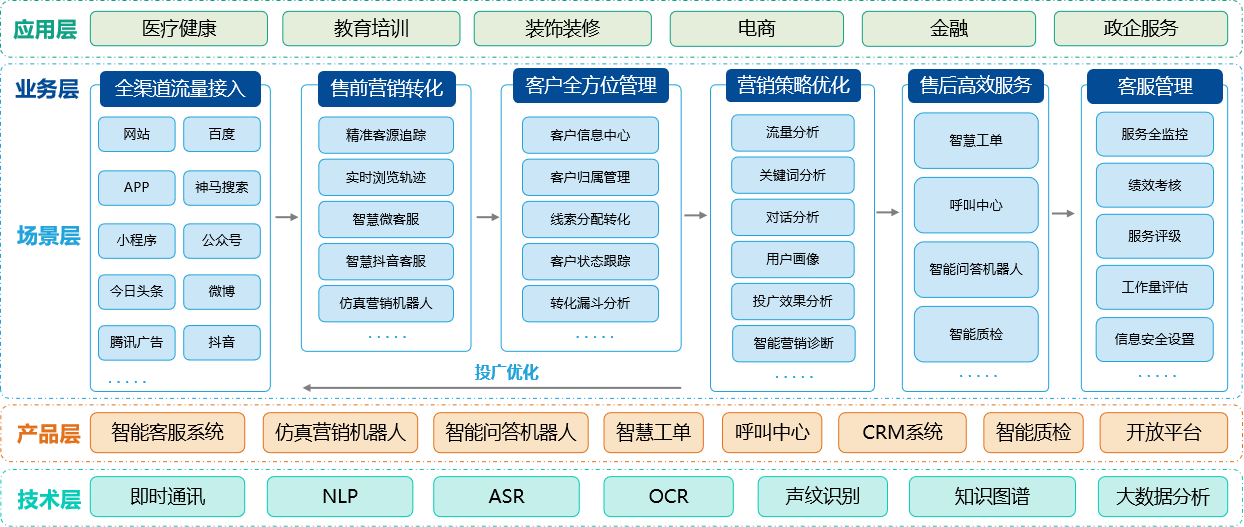 快商通,11年磨一劍,率先瞄準(zhǔn)AI客服+智能營(yíng)銷的巨大市場(chǎng)需求,構(gòu)建了包括智能營(yíng)銷客服系統(tǒng)、仿真營(yíng)銷客服機(jī)器人、智能問(wèn)答機(jī)器人、網(wǎng)頁(yè)電話回?fù)芟到y(tǒng)、工單系統(tǒng)等產(chǎn)品在內(nèi)的【智能客服云平臺(tái)】,幫助客戶打通【營(yíng)銷投放→售前接待→銷售轉(zhuǎn)化→客戶管理→售后服務(wù)】等營(yíng)銷閉環(huán)管理解決方案。通過(guò)智能化服務(wù)前端+數(shù)據(jù)中臺(tái)營(yíng)銷診斷,為客戶集成營(yíng)銷引擎能力,成為智能化營(yíng)銷利器。