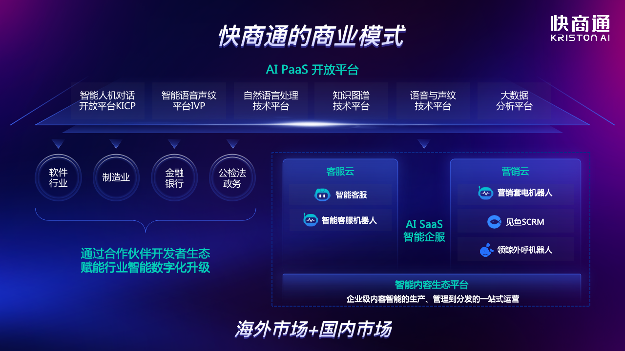 快商通通過「AI PaaS開放平臺」協(xié)同合作伙伴、開發(fā)者等賦能幫助軟件行業(yè)、制造業(yè)、金融銀行、公檢法政務(wù)等多個領(lǐng)域?qū)崿F(xiàn)智能數(shù)字化升級,通過「快商通AI SaaS智能企服」賦能中小企業(yè)完成供給側(cè)升級,實(shí)現(xiàn)產(chǎn)業(yè)營銷智能數(shù)字化。